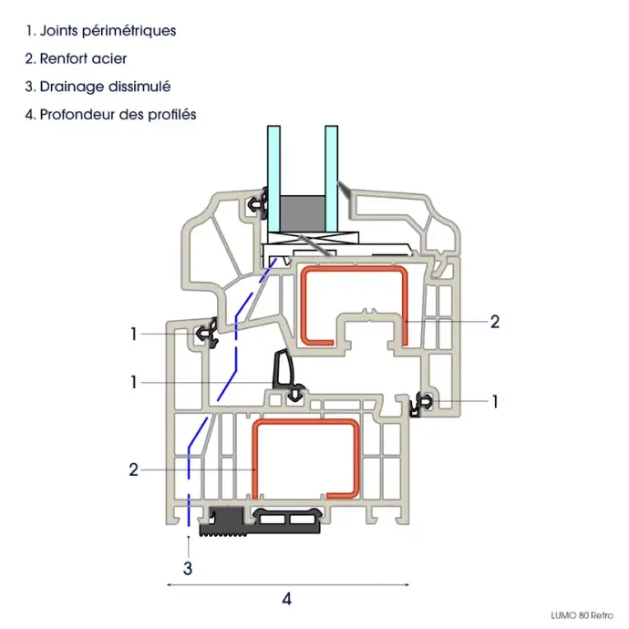 - Drainage invisible (3) : l'eau de pluie et de nettoyage qui peut pénétrer lorsque votre fenêtre est en position basculante est évacuée de manière invisible le long de la face intérieure, de sorte qu'aucun bouchon d'eau n'est visible